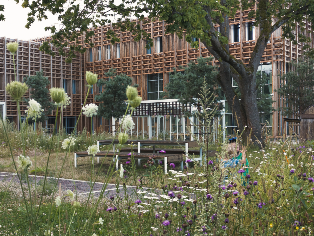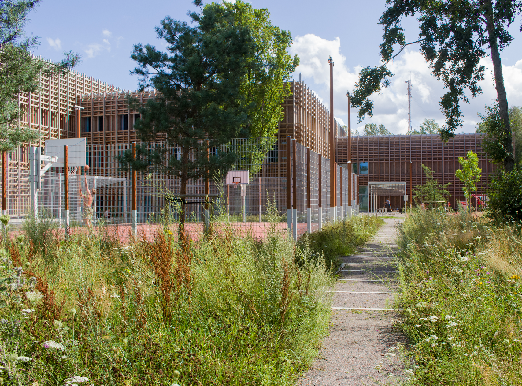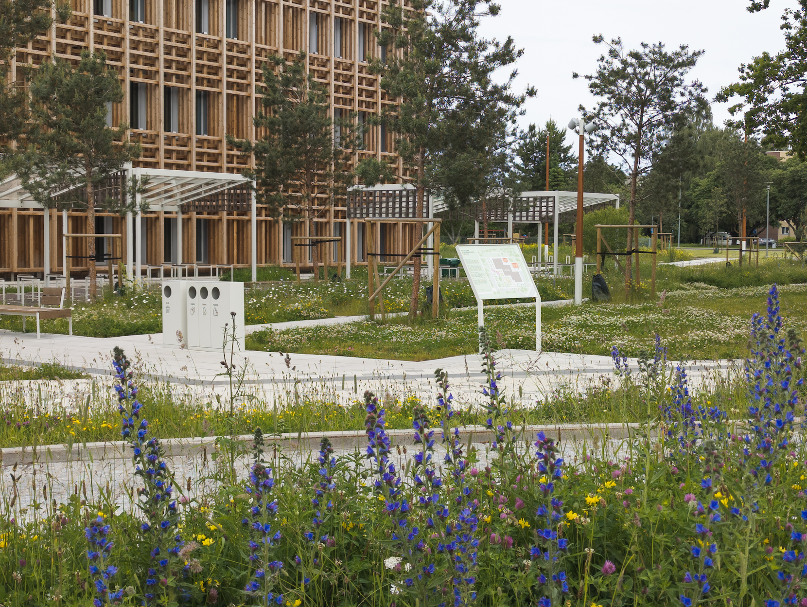 In addition to the load-bearing structure, timber has assumed various different roles in the building, for instance, as a smooth and warm bench, perforated acoustic panels as well as a streamlined banister. Also the façade is important – the timber lattice functions as a sun control and also creates a landscape of benches and nooks along the building.