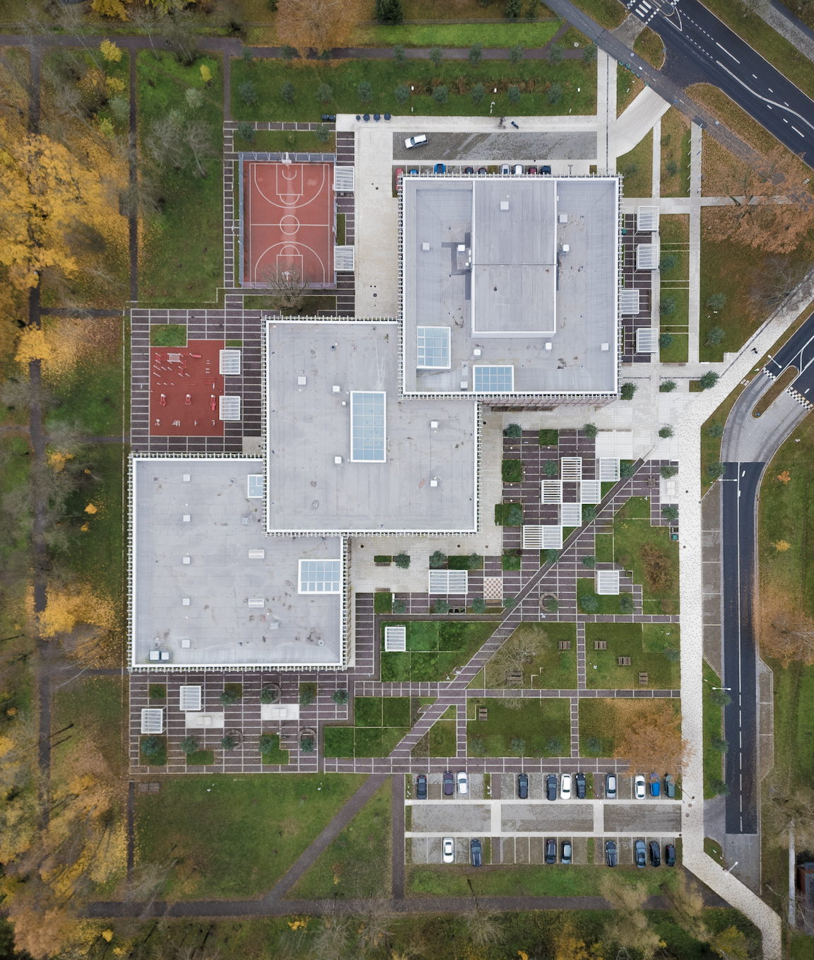 To marry the interior with the exterior, lush vegetation has been planted inside the building. The library, both spacious and with quieter alcoves, has a tall tree, with room to grow, just like the students studying at the school. There is also a spacious and attractive sports facility, which leaves the impression of merging with the stand of trees on the other side of expansive glass surfaces. In the sports hall, as elsewhere in the school building, bluish-green tones are predominant, emphasizing proximity to nature and creating a mellow atmosphere.