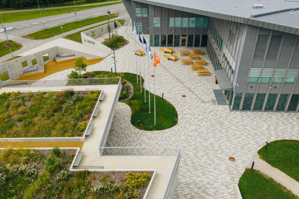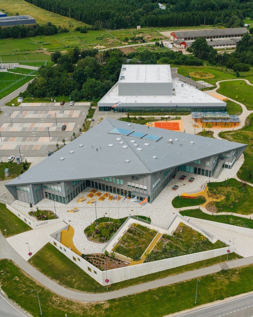 Rae high school was planned for 540 pupils and is symbiotically connected with the new athletic facility – both buildings were designed by KOKO Architects. The new school aims to offer local youths high-quality education close to home, with a focus on topics related to society and entrepreneurship supported by the businesses in the area. That goal is supported by the school building with its spacious and cosy rooms, with a modern learning environment incorporating elements of play. The layout of the rooms in the building is based on the cardinal directions – the north side has classrooms away from hot sunlight, while cafeteria and kitchen are in the south and west, and the administrative wing in the east. The interior was planned to allow students to have pleasant places to congregate and relax in the hallways and open areas.
