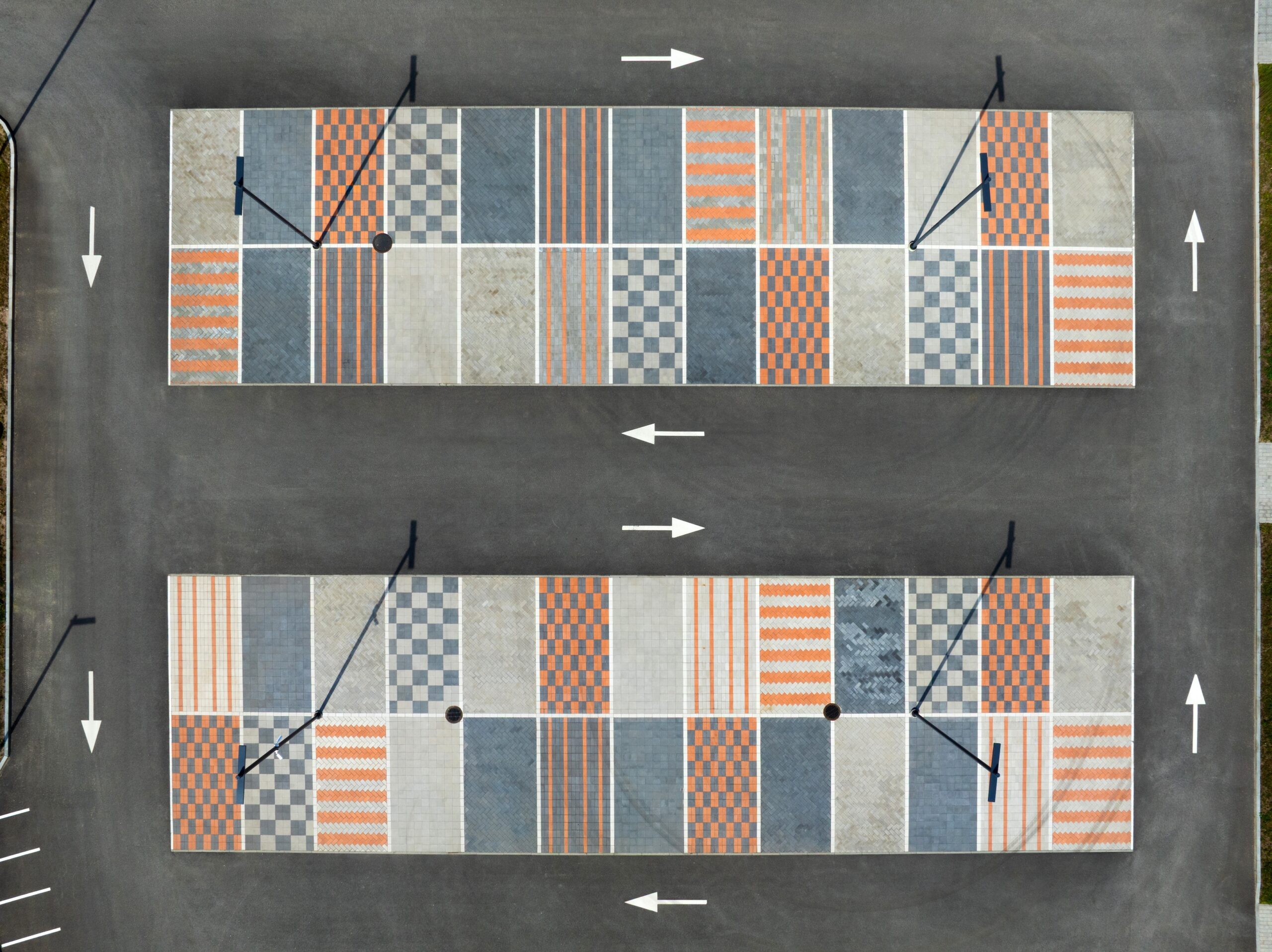 The spatial solutions are rational and built entirely of wood. We combined CLT walls and glulam posts and beams. The expressive canopy and the roof of the ball court have glulam lintels.