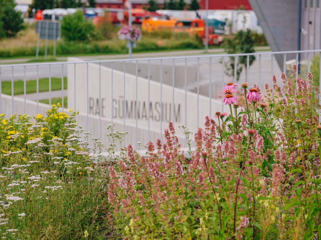 Rae Secondary School and the sports building are located in the centre of Jüri. The school with its courtyard is located to the south, opening towards Aruküla Road. The school yard is separated from the road by concrete noise walls of variable height, filled with green slopes. The sports building is on the north side of the plot. The buildings form an integrated whole surrounded by a common park area with various activities for older and younger children and local residents.