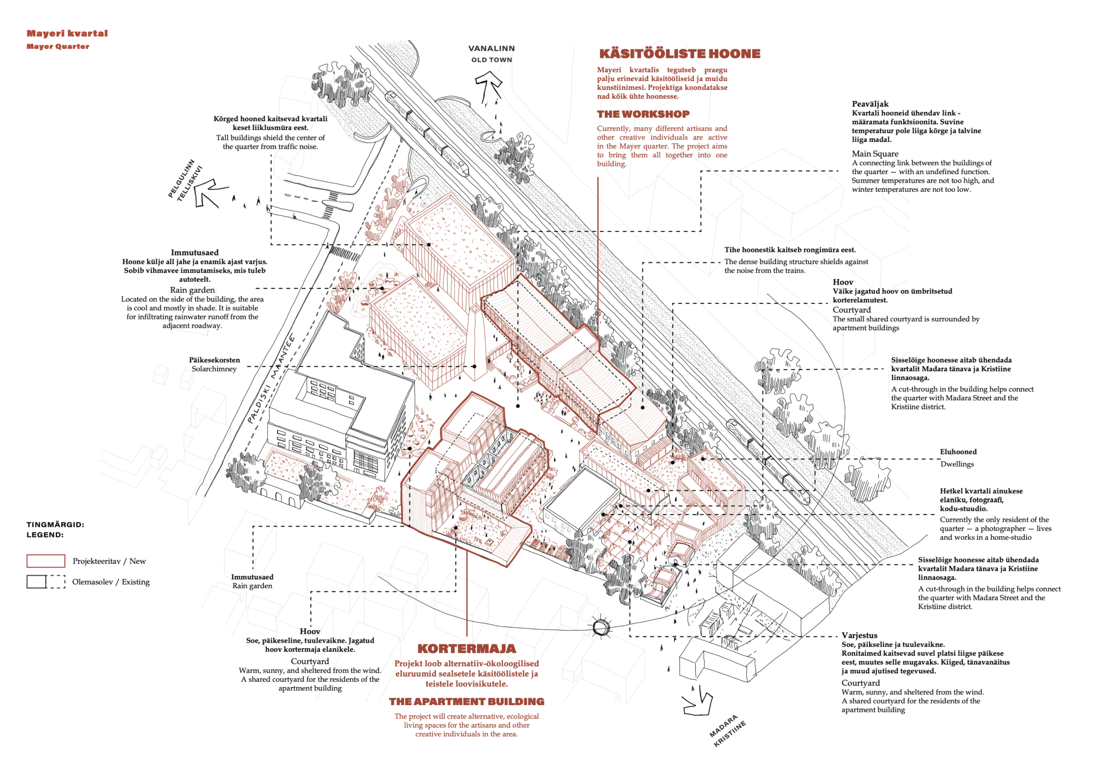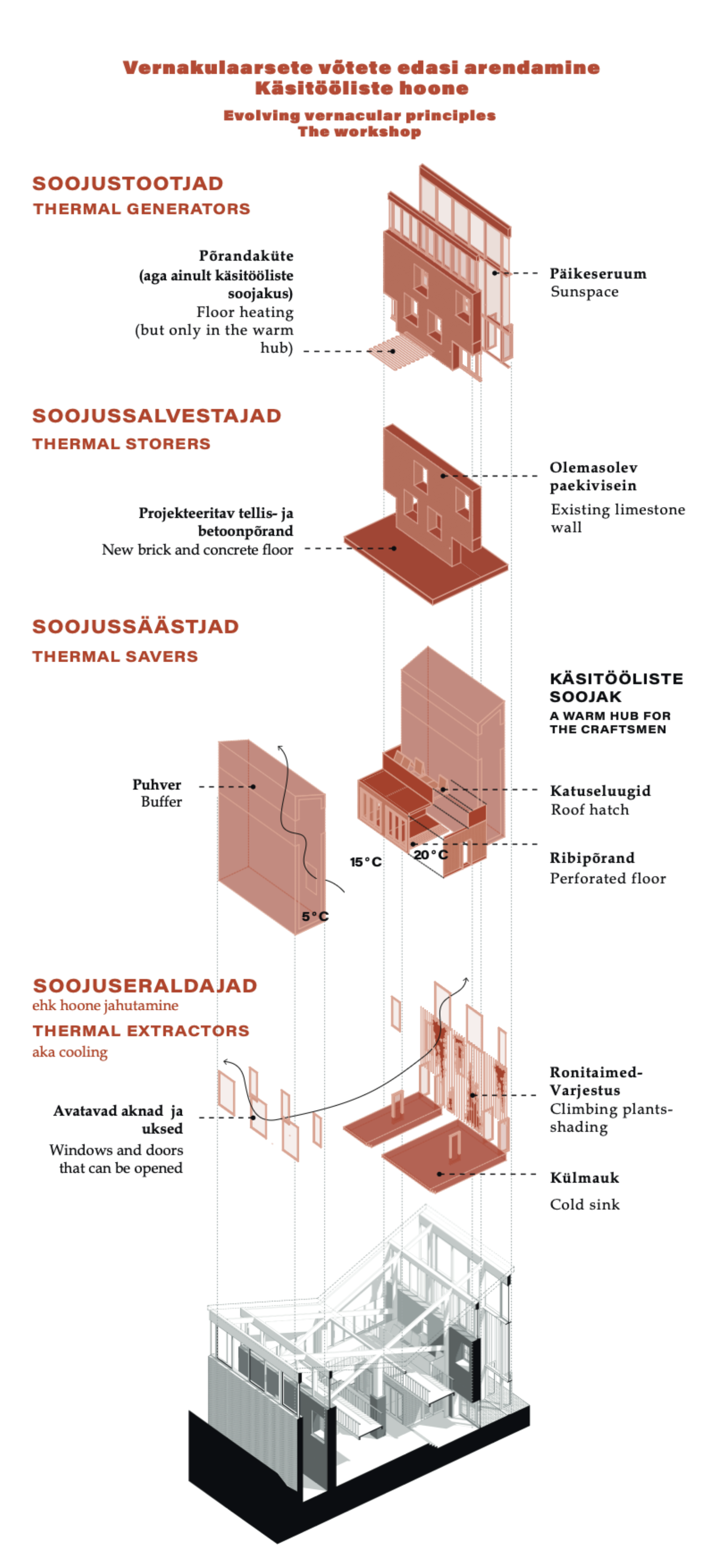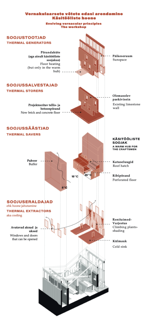 The focus of the MA thesis is to further develop the historical vernacular techniques and thereby question the current building practices and comfort standards. The starting point stems from the approaches to climate change that have transformed buildings into mere shells around the utility systems. This, in turn, has led to a situation where various relevant aspects of the problem such as the impact of utility systems on the climate as well as overconsumption are overlooked. These modernist practices have pushed the topics of indoor climate to the engineer’s desk while the architect can only formalise the shape of the building. The aim of the study of vernacularity is not to romanticise it but interpret the wisdom developed over the centuries. Advanced vernacularity does not require the abandonment of technologies, but rather the creation of a new hierarchy that prioritizes passive techniques, thus restoring the historical role of the architect as creator of indoor climate.